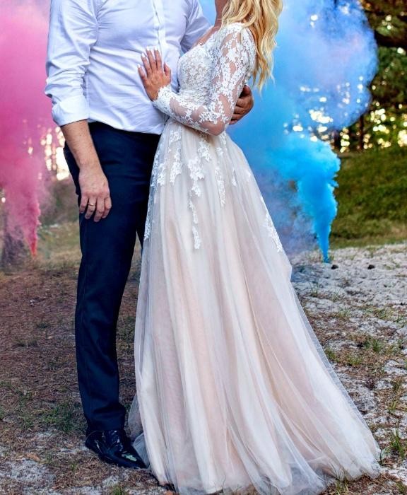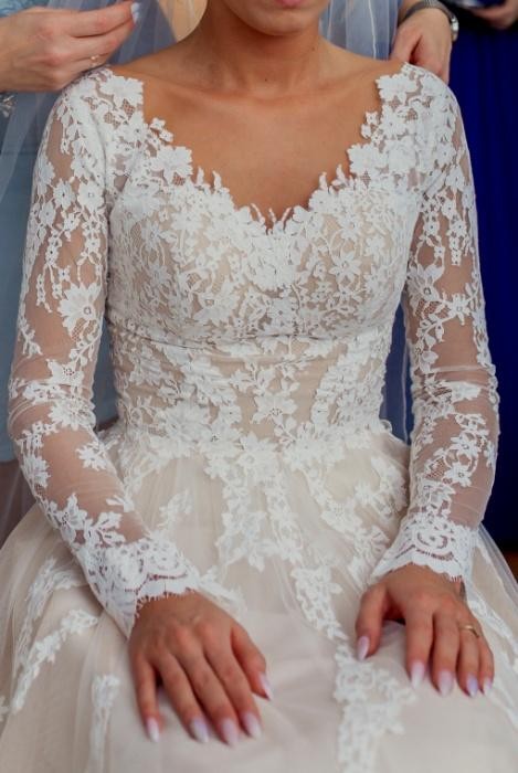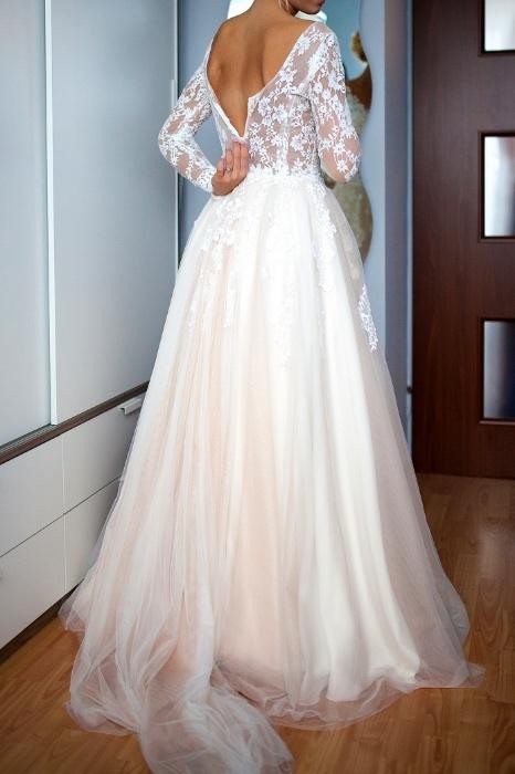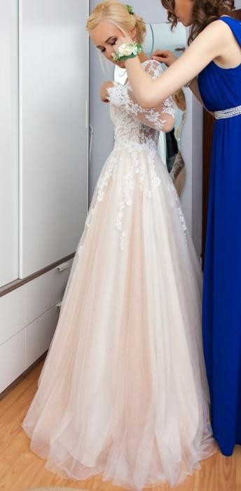 Sprzedam suknię ślubną Maggio Ramatti model 2017 Latino. Suknia została zakupiona nowa, uszyta na wzrost 165cm + 8cm obcas (rozmiar 34/małe 36). Posiada podpinany tren oraz wszyte miseczki. Koronkowy rękaw sięga lekko za nadgarstek. Suknia w kolorze cielistym/szampańskim (wg opisu salonowego), delikatna i bardzo wygodna.