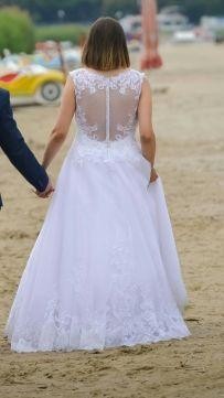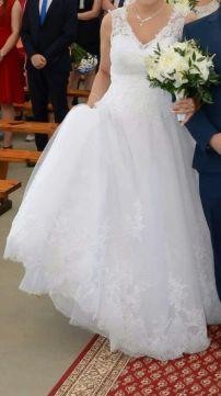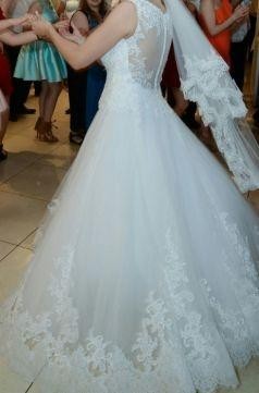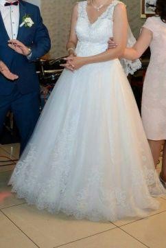 Sprzedam śnieżnobiałą suknie ślubna. Suknia pięknie się prezentuje i uklada. Góra koronkowa. Tył zapinany na guziczki. Miseczka wszyta w suknie. Suknia z kolem zakladanym odrebnie. Wzrost 176cm.