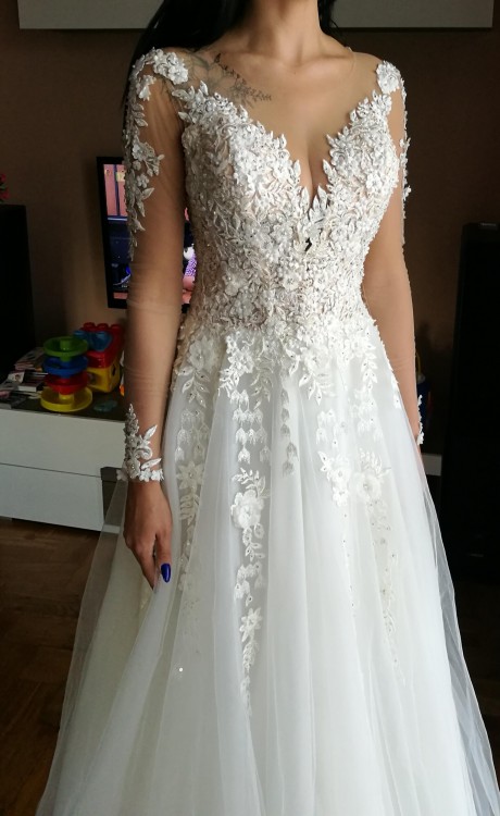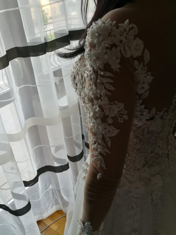 Suknia uszyta na wzrost 168 cm + 7 cm obcas. Pod warstwą tiulu jest podszewka z kołem, dzięki czemu suknia ładnie układa się. Cena do negocjacji ze względu na małe uszkodzenia - małe rozdarcie pod pachą i na pierwszej warstwie tiulu, jednakże krawcowa nie będzie miała z tym problemu.