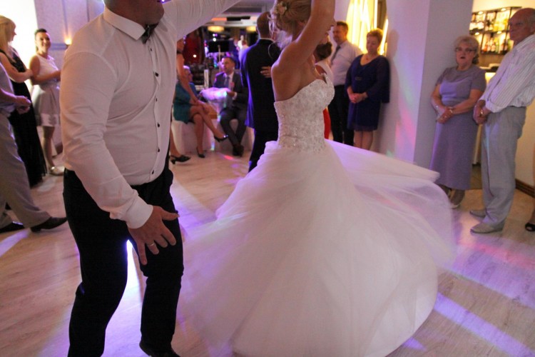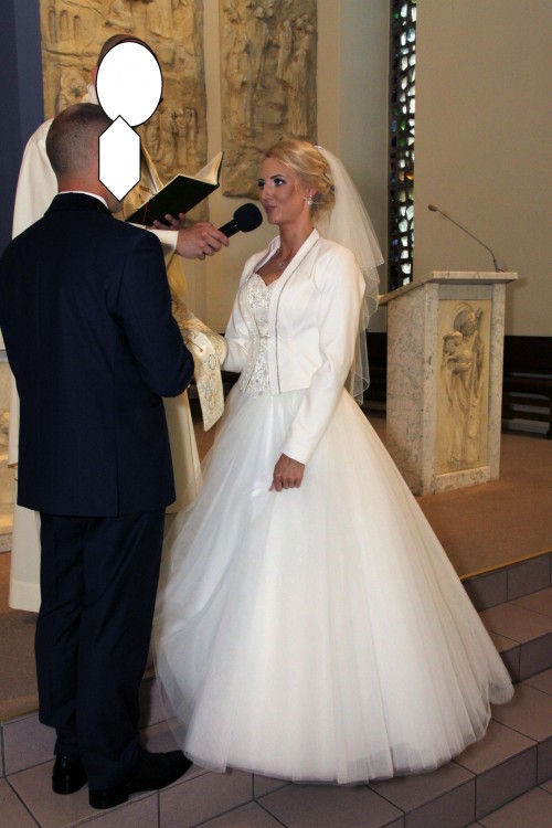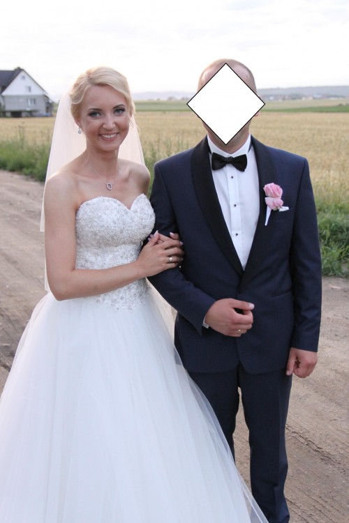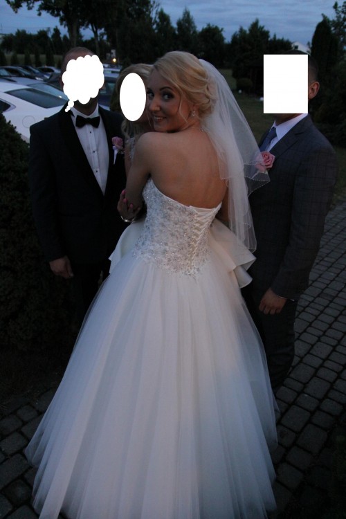 Suknia została poddana czyszczeniu w pralni chemicznej, nie posiada śladów użytkowania i uszkodzeń. Wspaniale prezentuje się podczas tańca. Do sukienki dodaje welon widoczny na zdjęciach, w razie potrzeby posiadam również żakiet idealnie pasujący do tego modelu a także baleriny firmy Fejkiel rozmiar 39 także wykonane na zamówienie.
