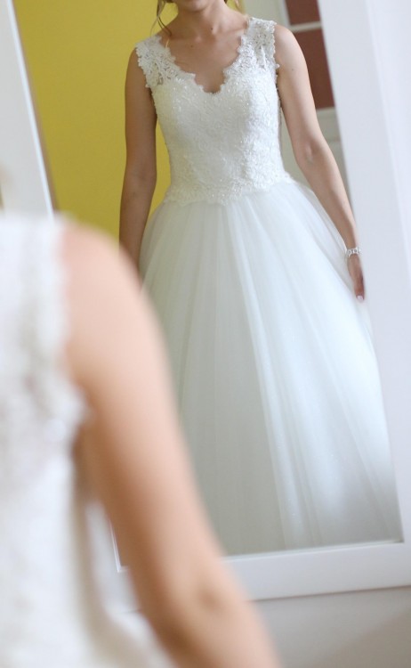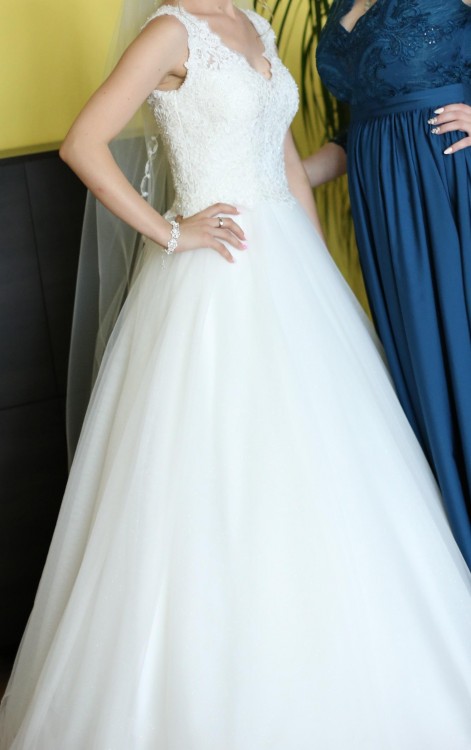 sukien ślubnych Mavi (kolekcja 2018) . Suknia była szyta na rozmiar 34 ,wzrost 156 + 8 cm obcas .