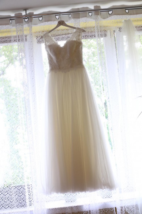 Suknia składa się z kilku warstw tiulu w tym jedna warstwa z mieniącym się brokatem . Góra sukni w większości zdobiona kryształkami a gdzie nie gdzie perełkami (tył zapięcia - zamek kryty )