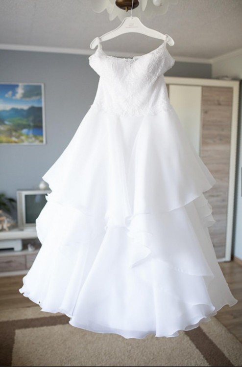 Witam! Mam na sprzedaż śliczną białą suknię ślubną. Została uszyta na zamówienie, zakupiona we wrześniu 2018 roku. Ubrana była w dniu ślubu oraz na sesji ślubnej. Sukienka została wyprana w profesjonalnej pralni, nie ma żadnych uszkodzeń. Sukienka ma możliwość małej regulacji za pomocą wstążki ukrytej pod koronką. Wymiary: wzrost 167cm +2cm obcas, biust 104cm, talia 90-94cm. Zainteresowane Pnie proszę o kontakt telefoniczny. Do sukienki dołączam welon, na brzegach delikatnie obszyty drobnymi kamyczkami.