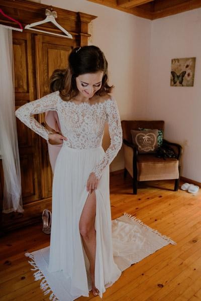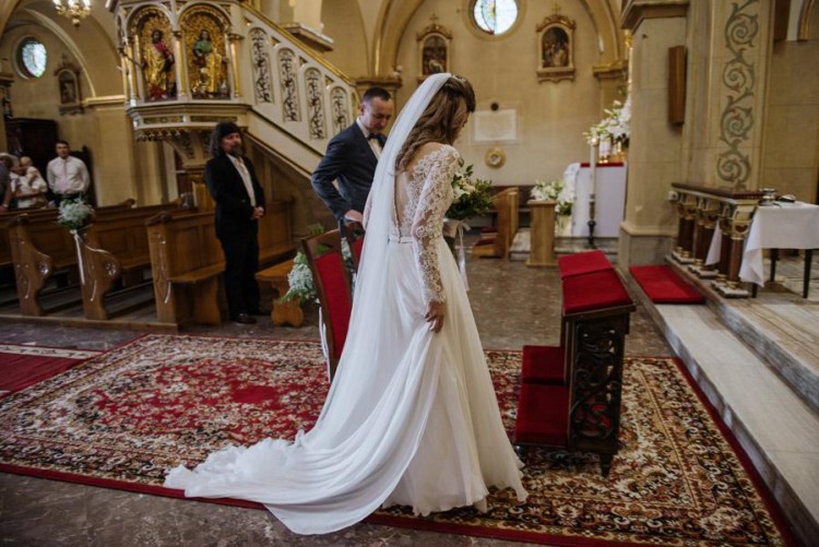 Do sukni w komplecie piękny tren całkowicie odpinany z dużej ilości muślinu oraz długi delikatny katedralny welon.