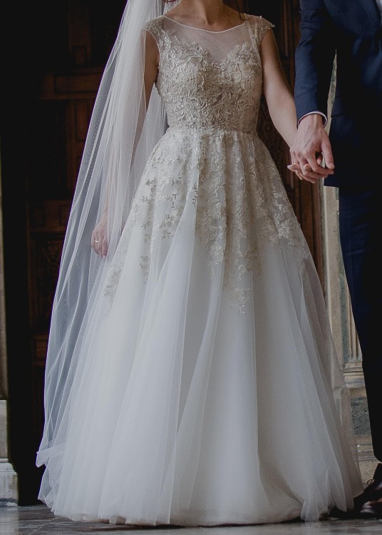 Suknia jest biała, posiada też aplikacje z pięknej, złotej koronki i wszyte miseczki (rozmiar B). Suknia składa się z kilku warstw z wszytą halką, jest zapinana na delikatne guziczki.