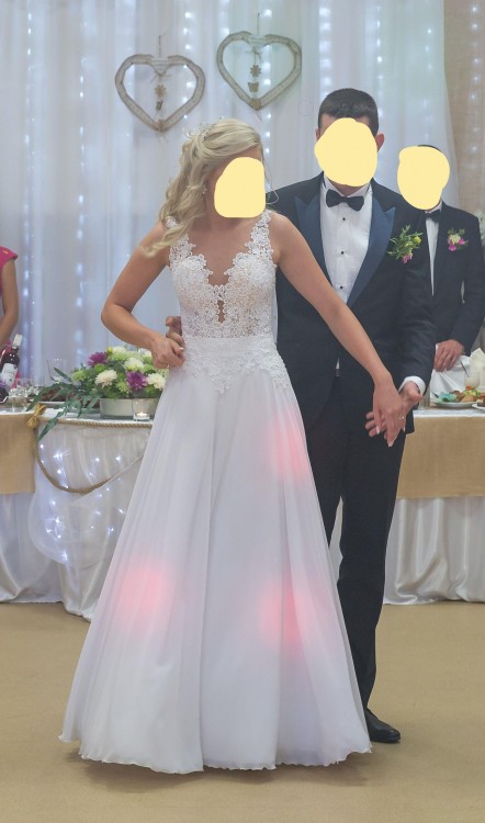Posiadam na sprzedaż piękną, prostą a zarazem elegancką suknię ślubną. Została zakupiona w Salonie Sukien Ślubnych LIVIA w Gdańsku, model KOSTARYKA, z kolekcji 2018, w kolorze śnieżnobiałym. Górna jej część wykonana jest z przepięknej koronki zdobionej delikatnymi kryształkami oraz perełkami. Tył jest zapinany na kryształowe guziczki . Dół sukni wykonany jest z muślinu, dzięki czemu jest lekka, zwiewna, pięknie się układa i nie gniecie. Posiada usztywnione, niewidoczne miseczki, dzięki czemu nie wymaga zakładania biustonosza (daje to bardzo duży komfort). Suknia pasuje na wysokość 165 cm plus 9 cm obcas, rozmiar S/M, pięknie podkreśla wcięcie w talii.