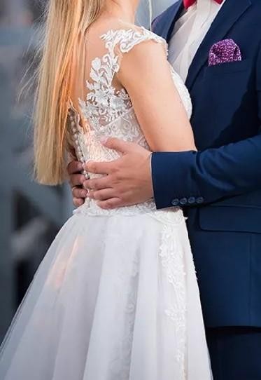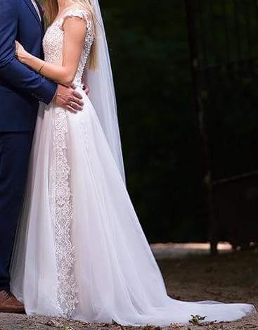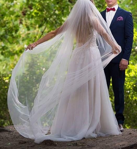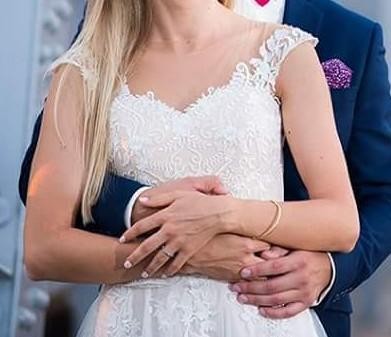 Mam do zaoferowania piękną lekka i bardzo wygodna suknię ślubną. Suknia była szyta na miarę rozmiar 34/36 do obcasa 11cm, posiada dopinany tren dzięki czemu podczas zabawy weselnej można go odpic. Do sukni dołąńczam długi welon oraz krótki. Po wiecej info zapraszam na priv.