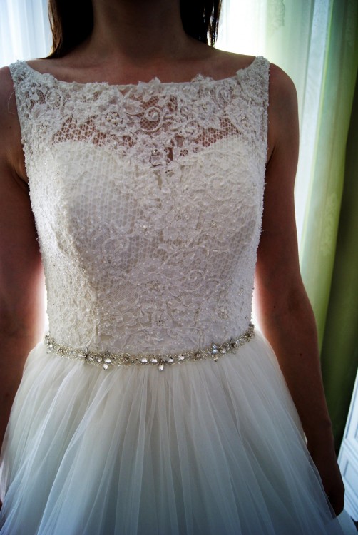 Sprzedam oryginalną suknię ślubną, model Willow marki Maggie Sottero. Suknia to typowa księżniczka i jest w amerykańskim rozmiarze 8 (europejski 38), pasuje na wzrost 170 cm plus 5-7-cm obcas. Suknia jest na kole, które można wyregulować i zdjąć na wesele. Z tyłu jest gorset, zamek błyskawiczny oraz guziczki, dzięki temu suknia nie spada, ani nie przesuwa się. Zarówno przód jak i tył ozdobione są piękną koronką, koralikami oraz kryształkami Swarovskiego. Dół oraz tren także są ozdobione koronką. Tren jest podpinany na trzy guziczki, także nie będzie przeszkadzał w tańcu.