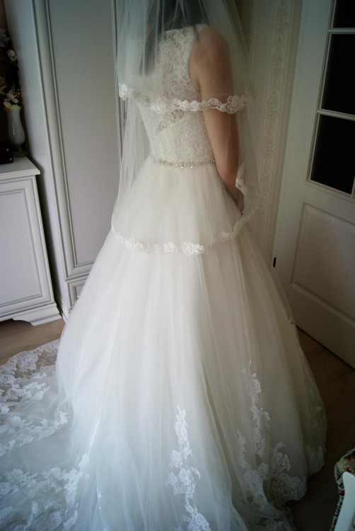 Cena katalogowa sukni z dodatkami to 4000 zł. Suknia jest w stanie dobrym, była tylko mierzona, nie była założona na ślub ani wesele. Trzeba by ją tylko odświeżyć i wyprasować.