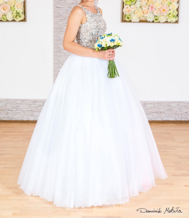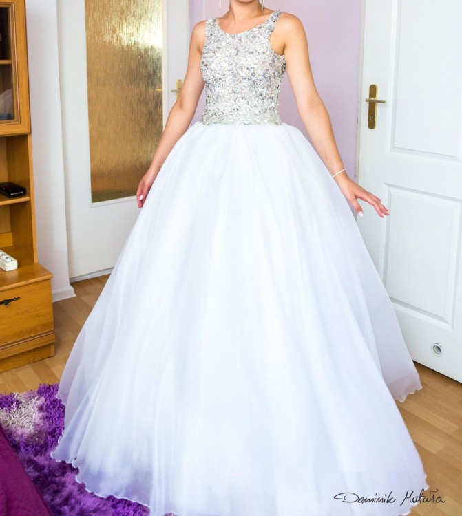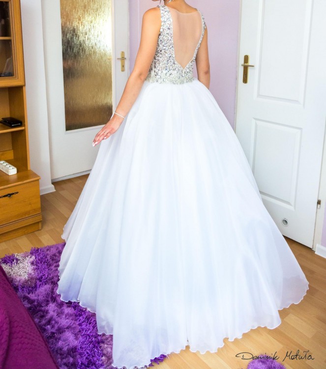 Piękna suknia w kolorze białym. Zdobiona kamieniami. Typ księżniczka, rozmiar 36