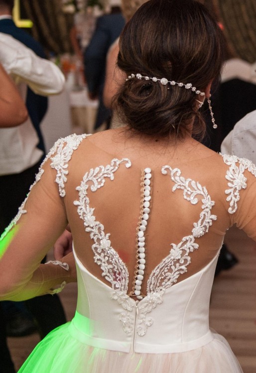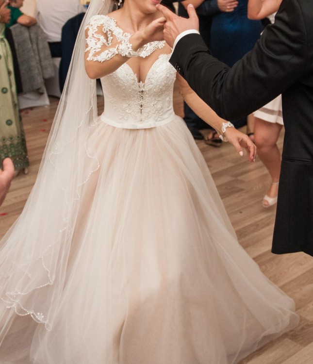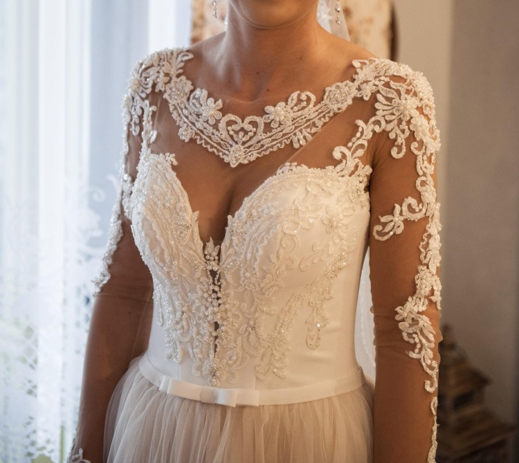 Gorset w kolorze ecru zapinany na guziki. Aplikacje z perełek,koronki i kryształków na miękkiej siatce. Dół spódnicy:pod drugą warstwą delikatnego tiulu dodany tiul w kolorze tofii. Cena do negocjacji.