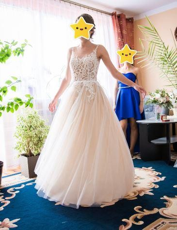 Sukienka posiada piękny siateczkowy gorset w kolorze nude, który w miejscu biustu nie prześwituje, zapinany jest z tyłu na guziczki - perełki i zdobiony hiszpańską koronką ecru, schodzącą na tiulowy dół, z którym delikatnie kontrastuje.