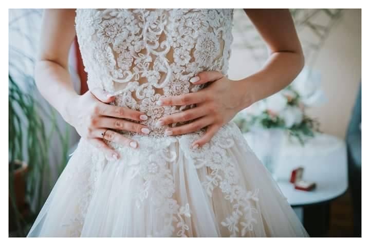 Sukienka posiada piękny siateczkowy gorset w kolorze nude, który w miejscu biustu nie prześwituje, zapinany jest z tyłu na guziczki - perełki i zdobiony hiszpańską koronką ecru, schodzącą na tiulowy dół, z którym delikatnie kontrastuje.