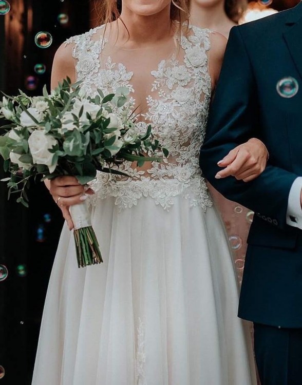 Góra sukni bogato zdobiona koronką w kwiaty 3D ..tiul delikatny róż z aplikacjami. Koszt nowej sukni to 3200 zł. Suknia na 165 cm .Delikatnie poszarpany tiul podczas wesela u dołu sukni... w razie pytań proszę o telefon!:) Obejrzeć to cudo można w Mińsku Mazowieckim pod Warszawą:)