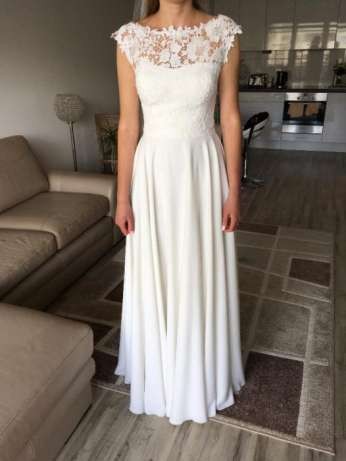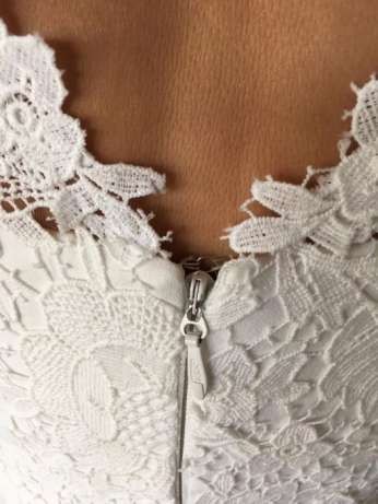 Koronkowa góra sukni, z delikatnej gipiury. Suknia zapinana na suwak i haftkę z trójkątnym wycięciem na plecach. Kolor sukni - śmietanowa biel.