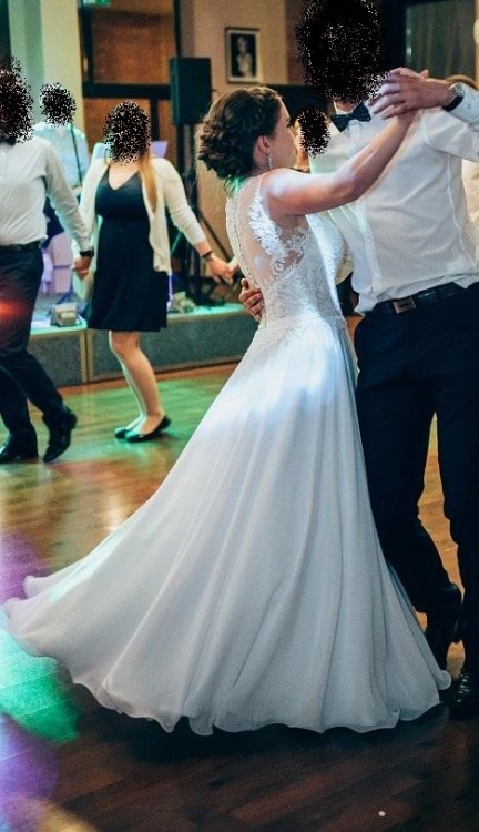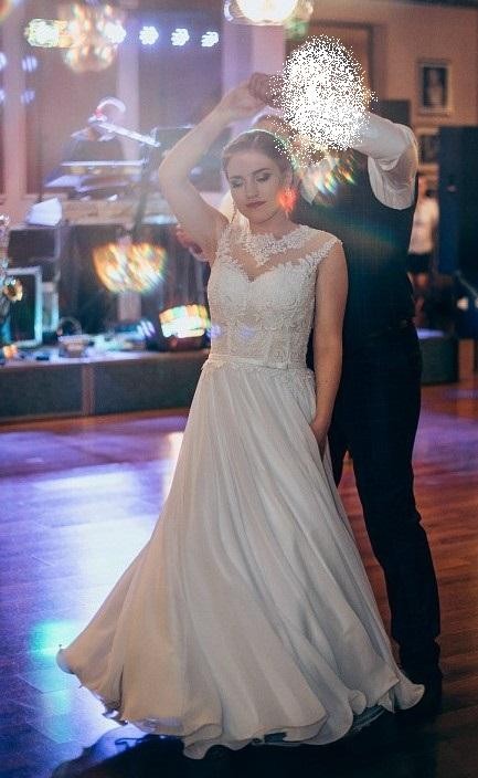 Suknia bardzo wygodna, lekka, pięknie układa się w tańcu. Zapinana na suwak i efektowne guziczki. Pasek z kokardką można zlikwidować lub zamienić na inny. Założona dwa razy, została wyprana w pralni.