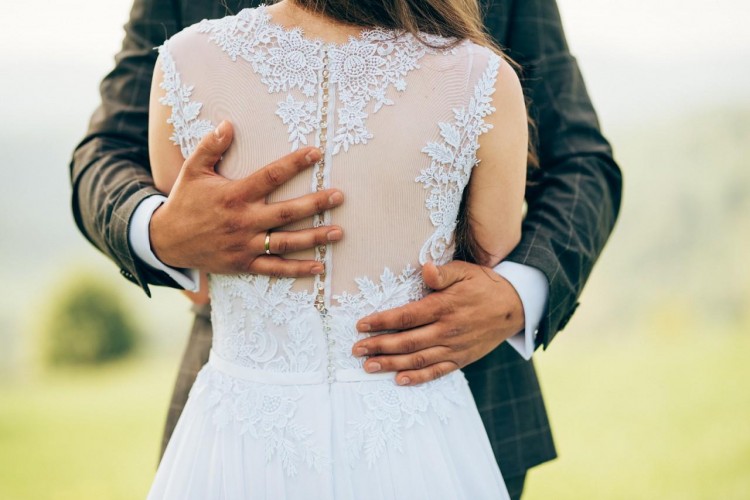 Suknia szyta na wymiar, rozmiar 36/38, wzrost 156cm + 10cm obcas, biust 75D z możliwością regulacji.