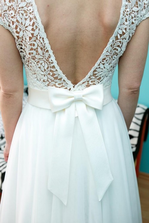 Góra sukni została wykonana na śmietankowym/ivory gorsecie wyciętym z tyłu do wysokości talii, pokrytym piękną delikatną gipiurową koronką. Plecy odkryte do wysokości talii, na które łagodnie zachodzi po bokach koronka. Przód wycięty w dekolt w kształcie łódki z delikatnym krótkim rękawkiem.