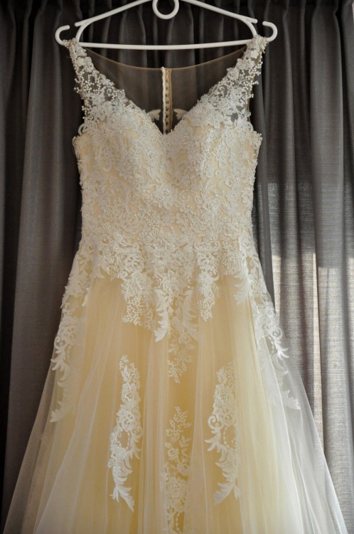 Suknia prócz podszewki posiada pięć warstw tiulu, przy czym cztery warstwy są w kolorze śmietankowym, a warstwa druga od góry - w kolorze ecru, co nadaje sukni delikatny miodowy kolor. Koronka na całej długości sukni w kolorze śmietankowym. Suknia zapinana jest na błyszczące okrągłe guziki. Dekolt w kształcie litery V, ze wszytym biustonoszem. Do sukni w komplecie jest również halka na kole, którą można zastosować aby nieco poszerzyć suknię.