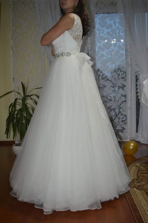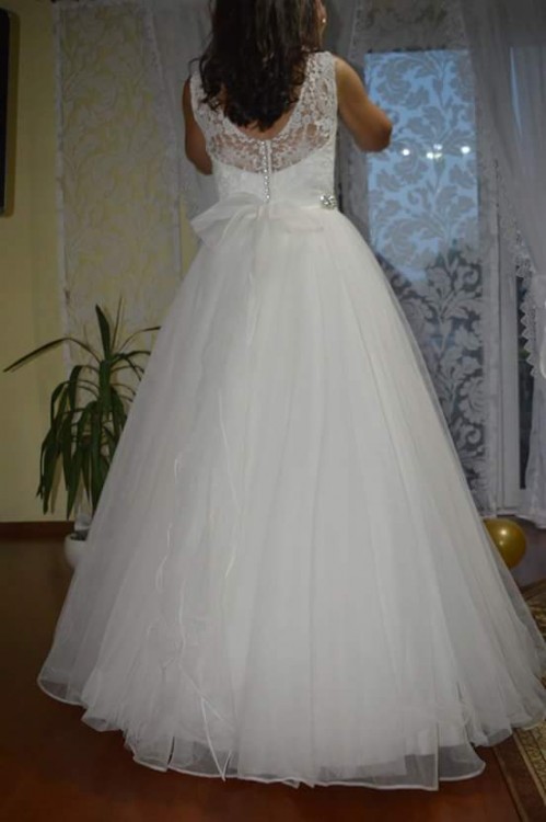 Suknia jest używana ale nie zniszczona. Będzie odpowiednią dla pań w rozmiarze 36-38. Na wzrost 160-170