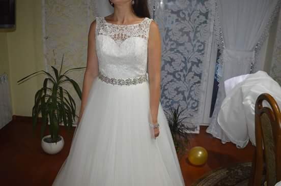 Do sukni gratis dorzucam dwa welony długi ok 2 M oraz krótki ok 65 cm. Suknia posiada pas zdobiony kryształami wiązany z tyłu na kokarde pas można odpiac . Suknia jest zapinan na zamek i posiada koło które jest osobną wiec można je założyć lub nie według uznania. Suknia można delikatnie przerobić posiada zapas materialu którym można manipulować. CENA PODLEGA NEGOCJACJ