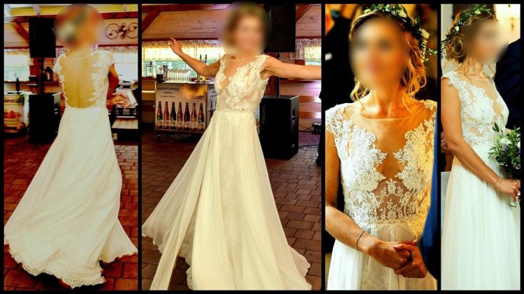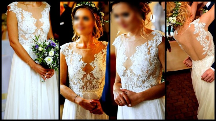 Suknia jest wykonana w całości z koronki gipiurowej w kolorze ecru z bardzo modnym cielistym podkładem oraz muślinowej spódnicy z rozcięciem, przez które podczas poruszania się widać warstwę koronki. Plecy są w większości odkryte, obszyte koronką w kształcie litery „U”, co daje naprawdę zachwycający efekt. Na plecach oraz na dekolcie znajduje się cielista siateczka. Zapinana jest na suwak znajdujący się na boku.