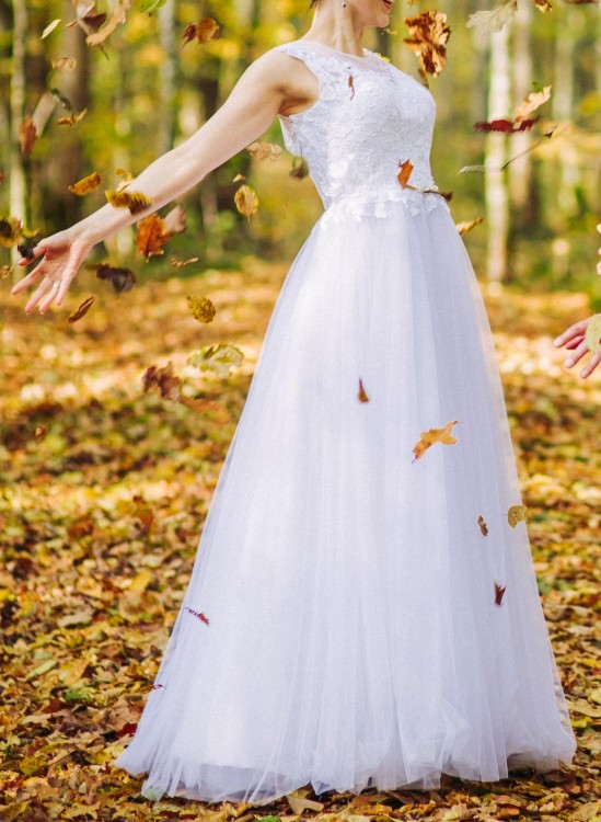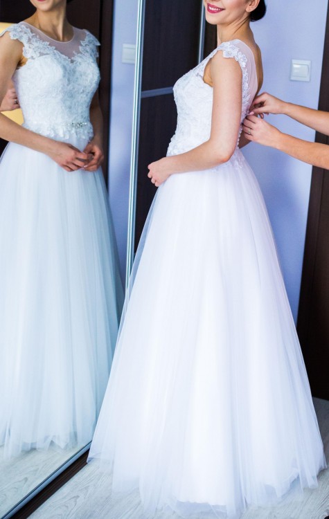 Góra jest wykonana z koronki z motywem kwiatowym z delikatną siateczką na plecach i dekolcie. Dół z kilku warstw dobrej jakości miękkiego tiulu, przez co suknia jest bardzo zwiewna i ładnie układa się w tańcu oraz pięknie wygląda na zdjęciach. Do sukni dołączam halkę z dwiema warstwami sztywnego tiulu, dzięki czemu suknia jest bardzo wygodna zarówno w tańcu, jak i podczas siedzenia.