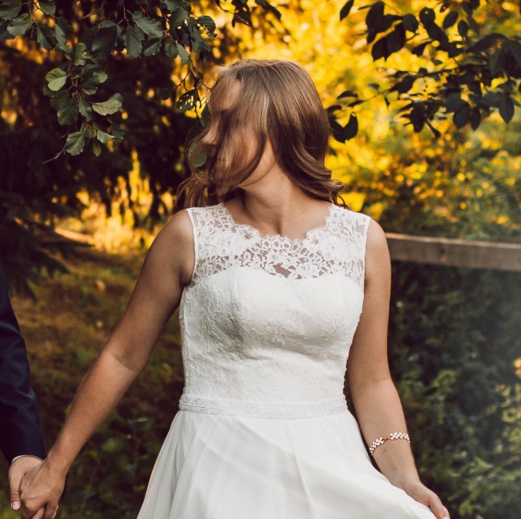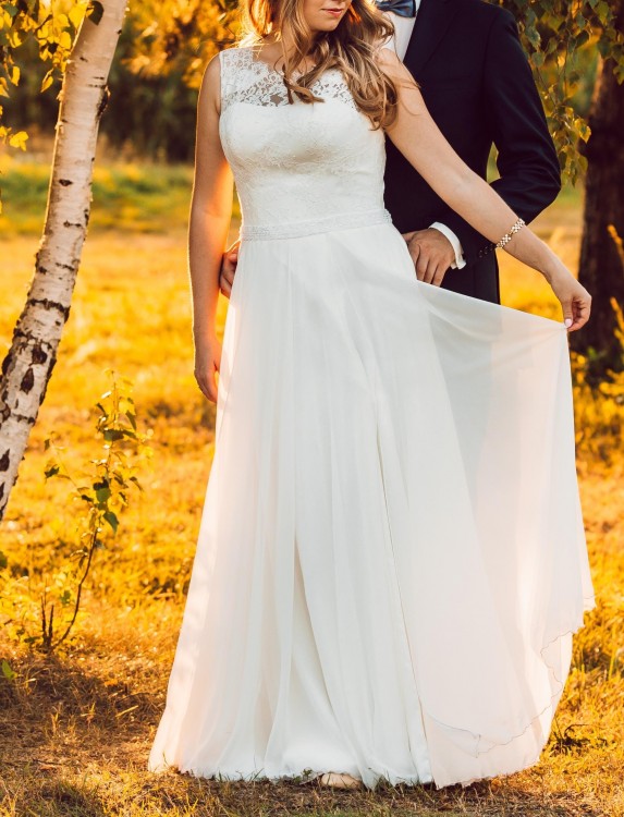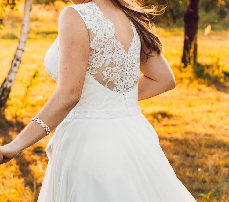 Góra sukni – fason na wzór sukni Marsylia, góra wykonana z bardzo delikatnej koronki z modelu Emma. Na dekolcie, pod koronką - satyna w łódkę.