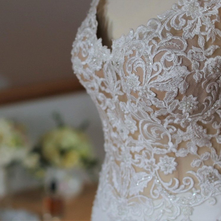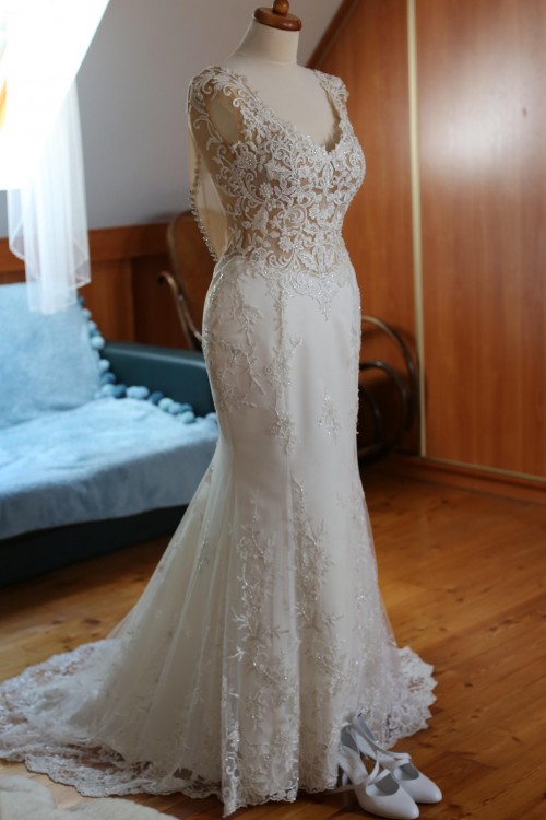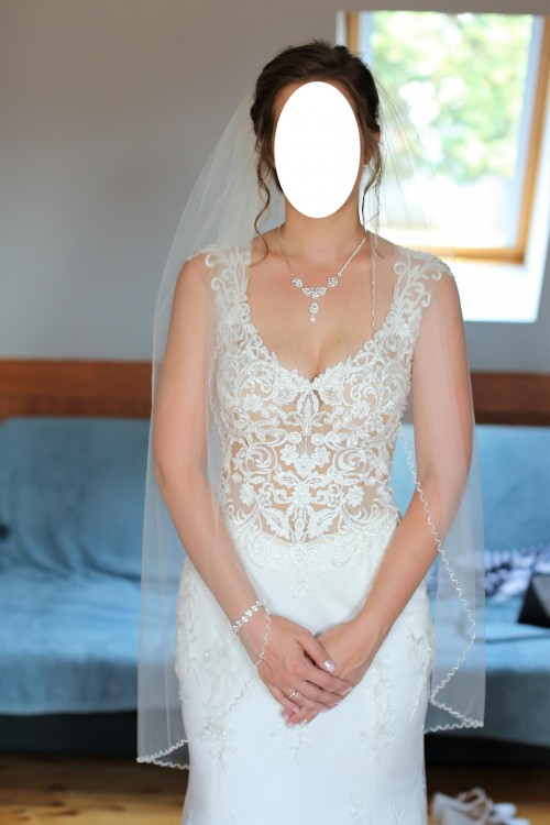 Suknia jest bardzo precyzyjnie wykonana z dbałością o każdy szczegół. Jest zdobiona ręcznie przyszywanymi koralikami oraz koronką na całej długości. Dzięki przemyślanemu ułożeniu zdobień, podkreśla atuty kobiecej figury. Na plecach znajdują się bardzo efektowne, mocno błyszczące, duże guziki. Suknia posiada tren który jest podpinany na dwa guziczki.