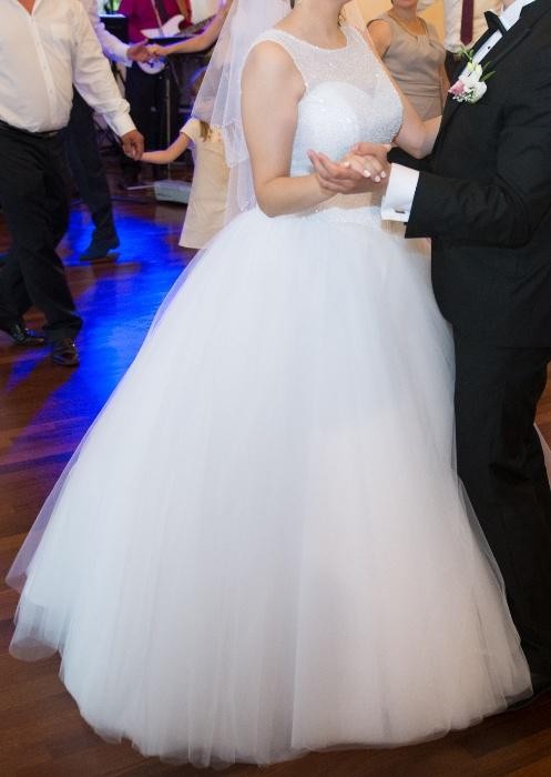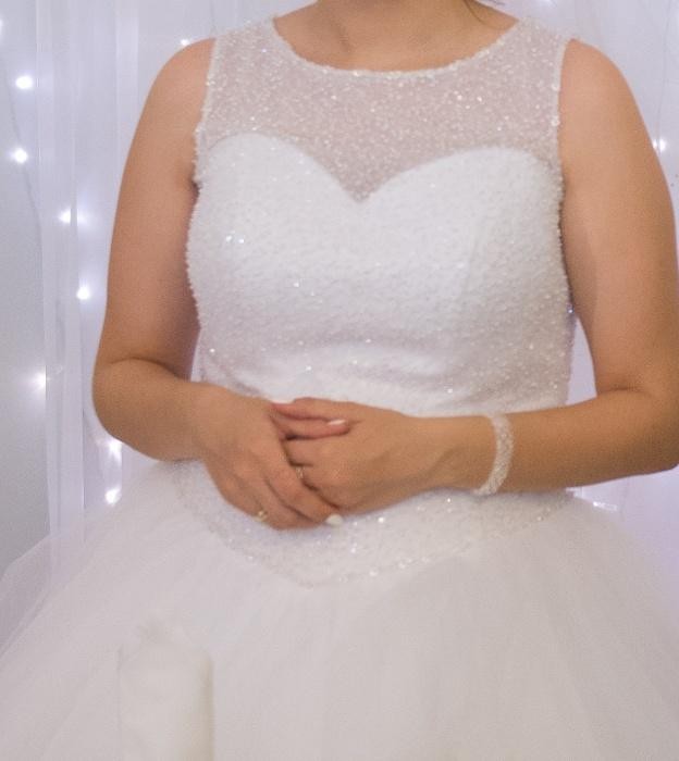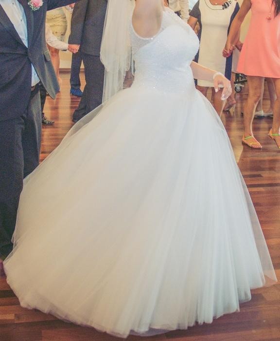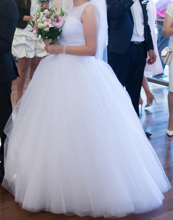 Suknia jest śnieżnobiała, z wielu warstw tiulu. Cała góra jest pokryta kryształkami, które odbijają światło. Proszę o kontakt tel.