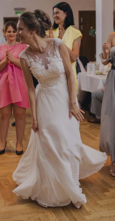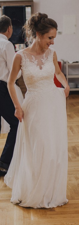 Mam do sprzedania piękną suknię ślubną firmy Agnes, model 15215. Kolor - śmietankowa biel. Została ona zakupiona w październiku 2016. Suknia posiada piękną koronkę, głęboko wycięte plecy, oraz dół delikatnego muślinu. Jest lekka, bardzo wygodna i pięknie układa się w tańcu.