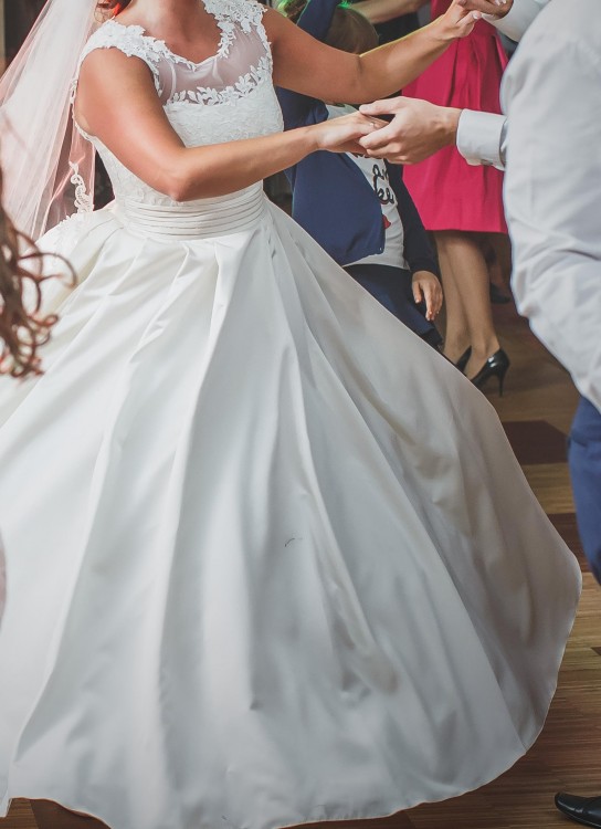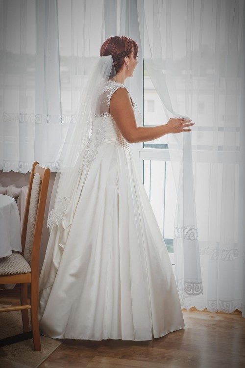Mam na sprzedaż piękną,klasyczną suknię ślubną zakupiona w salonie Agnes w Poznaniu- model 14017 , kolor krem. Suknia uszyta została na wzrost 165 cm + 8 cm obcas. ( Rozmiar 38/40) Zapinana jest na zamek i guziki. Dół sukni uszyty jest z satyny, posiada kontrafałdy i długi tren podpinany na guziczek, wszyte są też kieszenie. Spódnica nie posiada żadnych aplikacji na dole, dlatego tren można obciąć. Góra ozdobiona jest delikatną koronką. Wszyty został gorset, który modeluje sylwetkę. Suknia pięknie układa się w tańcu , wbrew pozorom nie jest ciężka. Została wyczyszczona chemicznie. Do sukni dodaję oczywiście koło.