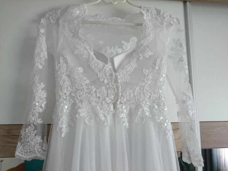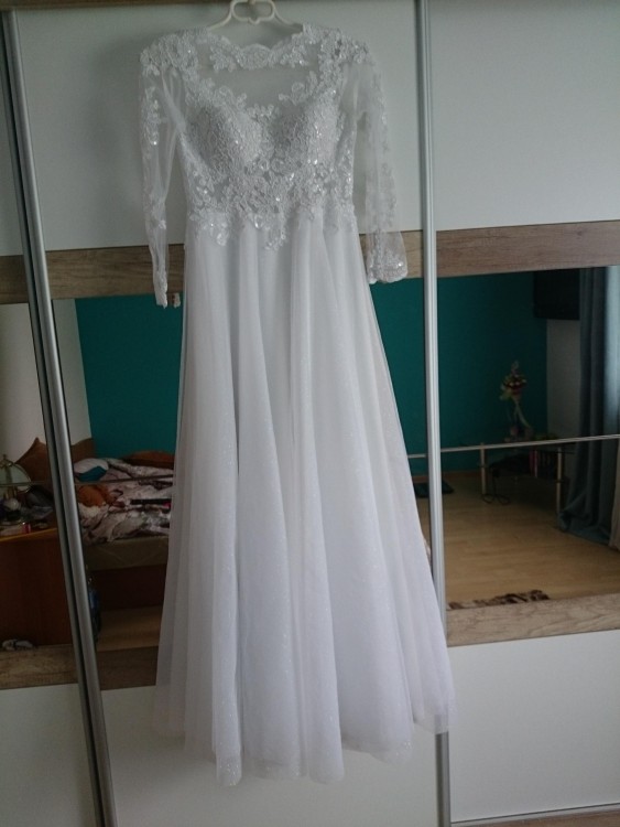 Sprzedam suknię ślubną szytą na miarę. Dekolt zabudowany, odkryte plecy, zapinana z tyłu na zamek i guziczki. Posiada wszyte miseczki oraz brokatową warstwę tiulu dodającą eleganckiego blasku (zdjęcia niestety nie oddają tego efektu). Nie posiada żadnych fiszbin, drutów dzięki czemu jest bardzo wygodna. Podczas wesela miałam założone małe elastyczne koło natomiast bez koła również jest wygodna zatem w tym temacie pozostaje dowolność. Suknia po praniu chemicznym. Cena podlega niewielkiej negocjacji. Po więcej szczegółów zapraszam pod nr telefonu lub na email andzelikak10@o2.pl.