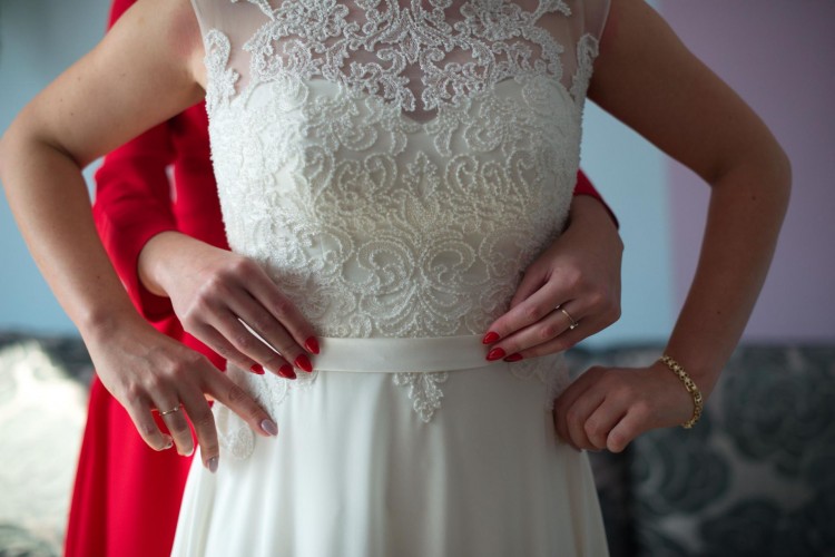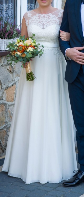 Suknia o fasonie litery A. Góra sukni wyszywana gipiurą oraz koralikami, dół wykonany z lekkiego, zwiewnego muślinu. Wycięte plecy w kształt litery V, zapinana na suwak. Dodatkowo wykonany pasek, który można odpiąć bądź jeszcze bardziej wyeksponować wyszywając kamieniami lub dopinając broszkę. Suknia profesjonalnie uszyta z siedmiu warstw materiału (dwie wierzchnie muślinowe), nie wymaga halki, pięknie się układa.
