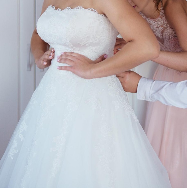 Szyta na miarę na wzrost 170cm + 8 cm obcas. Możliwość skrócenia. Suknia na gorsecie bardzo lekka i wygodna. Suknia wraz z dwoma welonami, krótki 80cm , długi 2,5m oraz bolerkiem. Dodatkowo dokładam koło.