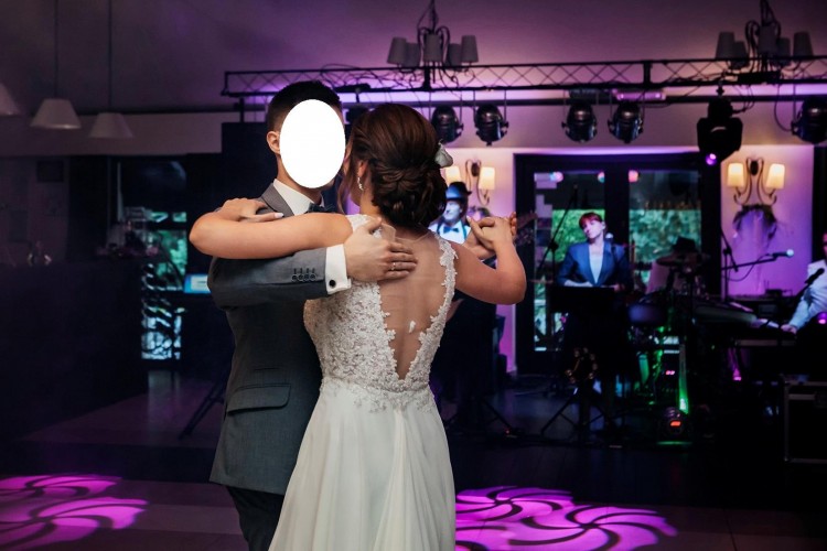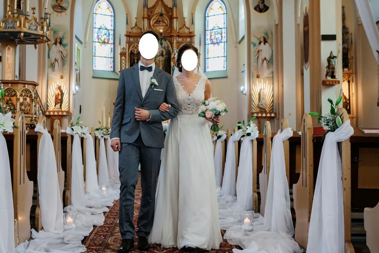 Plecy wycięte w głębokie "V". Z przodu i z tyłu cielista siatka. Dekolt trochę bardziej zabudowany w stosunku do oryginalnej wersji tego modelu. Został także przedłużony tren (tren jest jedną, zwiewną warstwą muślinu), ponieważ w oryginalnej wersji źle się układał po podpięciu. Podpinany na jeden guzik, z którym nic się nie stało przez całe wesele, tren w niczym nie przeszkadzał.