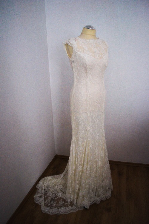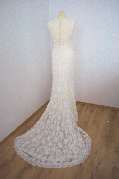 Suknia ślubna wykonana z francuskiej koronki. Kupiona w renomowanym salonie Agnes w Krakowie. Suknia ma krój syrenki i jest pokryta 3- warstwami delikatnej koronki, na całej długości na ramiączkach dopięta jest elastyczna podszewka, co sprawia ze sukienka nie krępuje ruchów. Jest lekka, zwiewna. Do dołu sukni wstawione są dodatkowe godety co sprawia , że podczas tańca suknia pięknie wiruje. Zapinana na zamek i guziczki, tren podpinany. Szyta na wzrost ok. 164 cm + 8 cm obcas , rozmiar 38/40 bez problemu można ją przerobić .