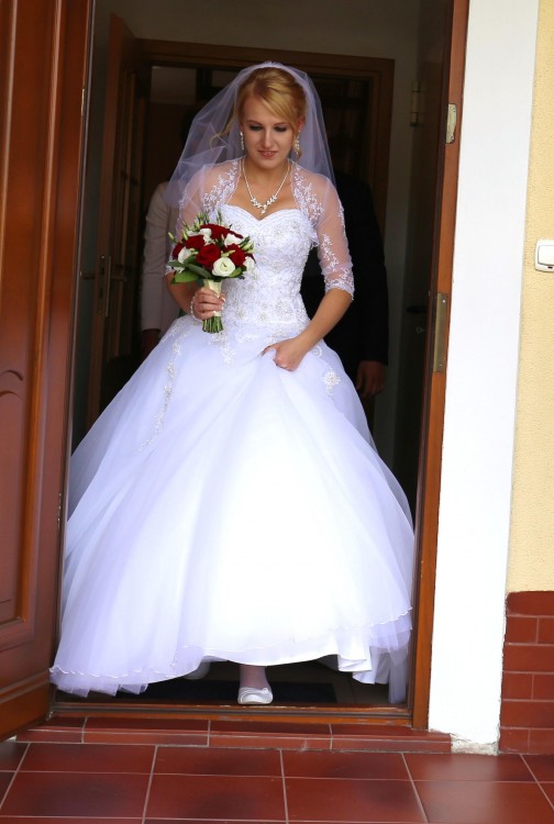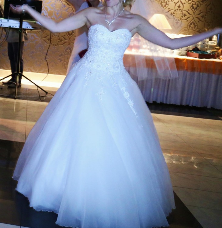 Suknia jest w idealnym stanie- wyczyszczona w macierzystym salonie, cały spód zrobiony na nowo (brak jakichkolwiek oznak "ciągnięcia po ziemi", przydepnięcia itd.)