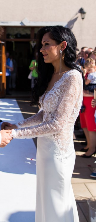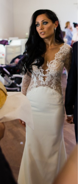 Niezwykle kobieca i zmysłowa suknia szyta na wzrost 163 cm + 8 cm obcas. Kolor kość słoniowa. Suknia jest w bardzo dobrym stanie, założona tylko w dniu ślubu, czyszczona w pralni. Plecy sukni są odkryte, przód to nieregularna litera "V", idealnie podkreślająca biust. Góra sukni uszyta z lekko prześwitującej koronki co nadaje jej lekkości. Jest pięknie i starannie wykończona, dół jest gładki, posiada delikatny tren dzięki któremu taniec jest swobodny. Jest lekka i wygodna. Cena sukni w salonie to 5 000 zł. Suknie można przymierzyć w Krakowie.