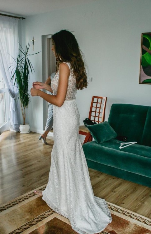Suknia zachwyca swoim wyglądem, ręczne wykonanie z najwyższej jakość materiałów.Suknia jest wykonana z włoskiej przepięknej koronki z elementami kryształów Swarovskiego. Pod koronką jest cielista, zupełnie niewidoczna siateczka. Beżowe miseczki w rozmiarze B są wszyte, ale z łatwością można je wymienić i dopasować do wymiarów nowej właścicielki :)