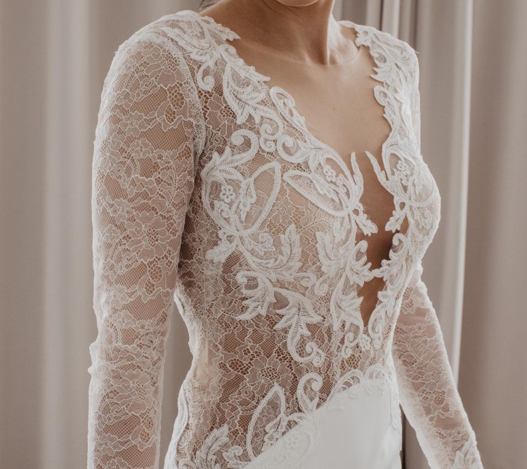 Góra sukni jest uszyta z francuskiej koronki, naszywanej na cielistą, delikatną siateczkę. Plecy pięknie wycięte w literkę V.