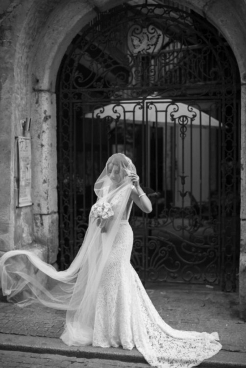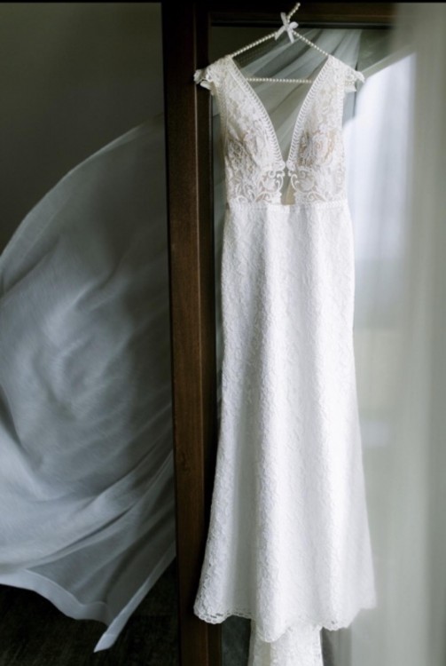 Suknia podkreśla figurę, ładnie eksponuje plecy z podpinanym trenem. Suknia wykonana z bardzo wysokiej jakości koronki, idealnie się układa oraz nie gniecie się.