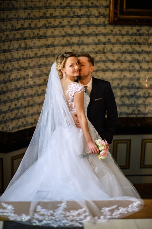 Posiadam również dwa welony: długi wykończony koronką z sukni (150 zł) oraz krótki gładki, by nie przysłaniał efektownych pleców (70 zł)