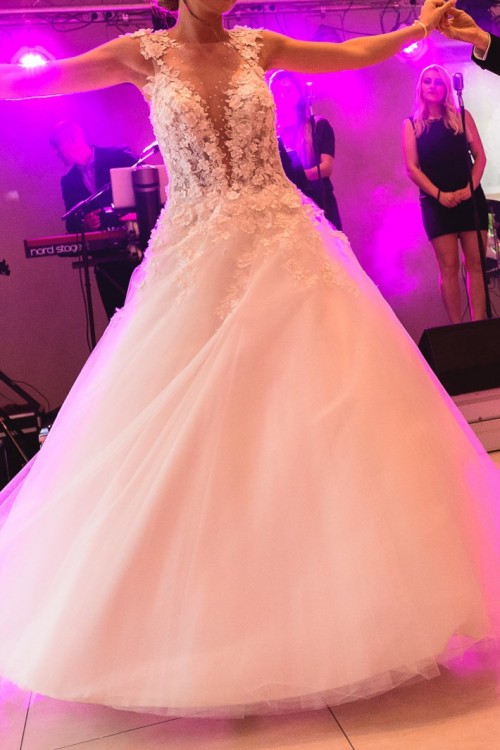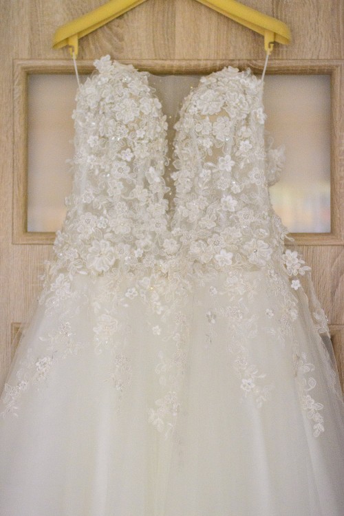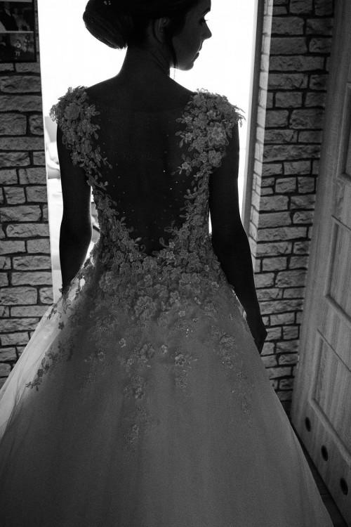 Suknia posiada ręcznie wyszywane kwiaty 3D nieregularnie wychodzące na cielisty tiul pokrywający plecy i dekolt, w kolorze Ivory.