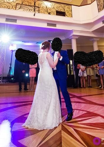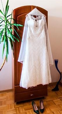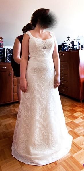 Jestem pierwszą właścicielką, a więc suknia była założona tylko raz :) zakupiona w warszawskim salonie Carmen za cenę 4200 zł. Szyta na miarę w salonie. Rozmiar 40, wzrost 165 cm + 10 cm obcas. Suknia jest już po pralni i brak na niej uszkodzeń. Suknia posiada gorset na sznureczki, co powoduje, że idealnie dopasowuje się do ciała i nie przesuwa w trakcie zabawy. Dlatego można ją dopasować do rozmiarów 38-42, a przy przeróbkach krawieckich również mniejsze rozmiary. Guziczki na całej długości pleców, na dole nieduże koło, które jest wyjmowane. Suknia w całości wykonana z koronki ma dodatkowe drobne cekinki na biuście i biodrach, które delikatnie się mienią. Posiada wszyty biustonosz podkreślający piękny dekolt sukni. Nie powinno być problemu z wypruciem go w razie potrzeby. Suknia jest w wersji bez trenu.