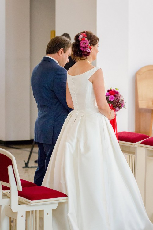 Suknia bardzo elegancka, piękna w klasyczny sposób, niesamowita dbałość o szczegóły, precyzja wykonania. Suknia ma wszytą halkę, wewnętrzny gorset i zakładki w pasie, dzięki czemu pięknie się układa.