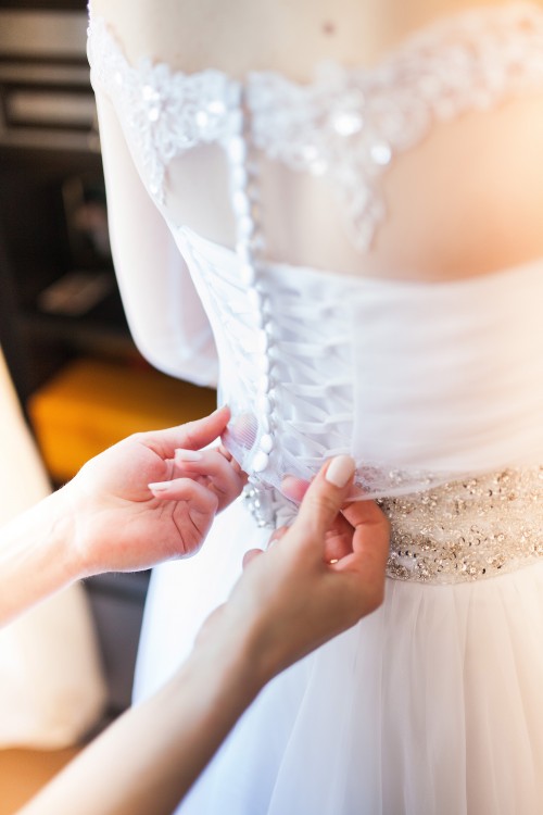 Suknia posiada wiązany gorset a w środku ma specjalny pas gumowany, zapinany na haftki dzięki czemu suknia nie przesuwa się w żadną stronę.