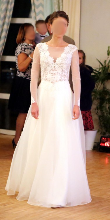 Romantyczna suknia ślubna w kolorze kości słoniowej (ivory). Góra wykonana z delikatnej, elastycznej siatki ręcznie wyszywanej francuską koronką. Ozdobiona dyskretnie połyskującymi koralikami. W suknię wszyty jest stanik typu push-up w kolorze ciała (miseczka B-C). Suknia w subtelny sposób odsłania linię dekoltu. Na plecach siatka z linią guziczków imitująca głębokie wycięcie w kształcie litery V. Rękawy wykonano z tej samej siatki i wykończono u dołu koronkową aplikacją. Rękawy można w bardzo prosty sposób odpruć tuż po ceremonii ślubnej, więc suknia nadaje się zarówno na bardzo ciepłą jak i chłodniejszą aurę. Dół sukni wykonano z najwyższej jakości satyny oraz zwiewnego szyfonu, który dodaje sukni lekkości oraz pięknie układa się zarówno podczas chodzenia jak i w tańcu. Sprawia on, że sukienka jest subtelna i zarazem elegancka.