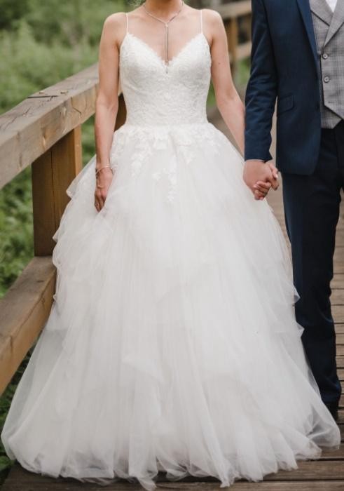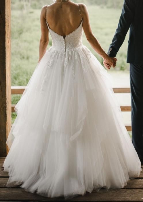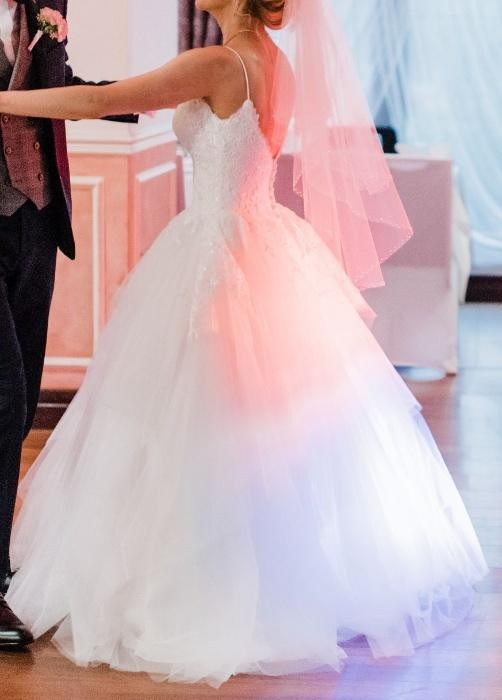 Suknia byla szyta na miarę talia 67cm, wzrost 167 plus szpilka 7cm. Wyprana i gotowa do użycia. Do sukni dołączone jest koło. W moim projekcie suknia nie ma trenu. Odebrana z salonu w kwietniu 2018 r. Mam paragon i umowę zakupu. Zapraszam do oglądania: w tygodniu w Warszawie, w weekend w Radomiu, po wcześniejszym umówieniu.