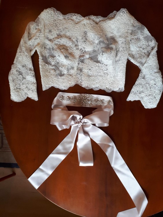 1. Koronkowe bolerko z rękawem 3/4 (do kompletu, z tej same koronki co suknia), zapinane z tyłu na guziczki.